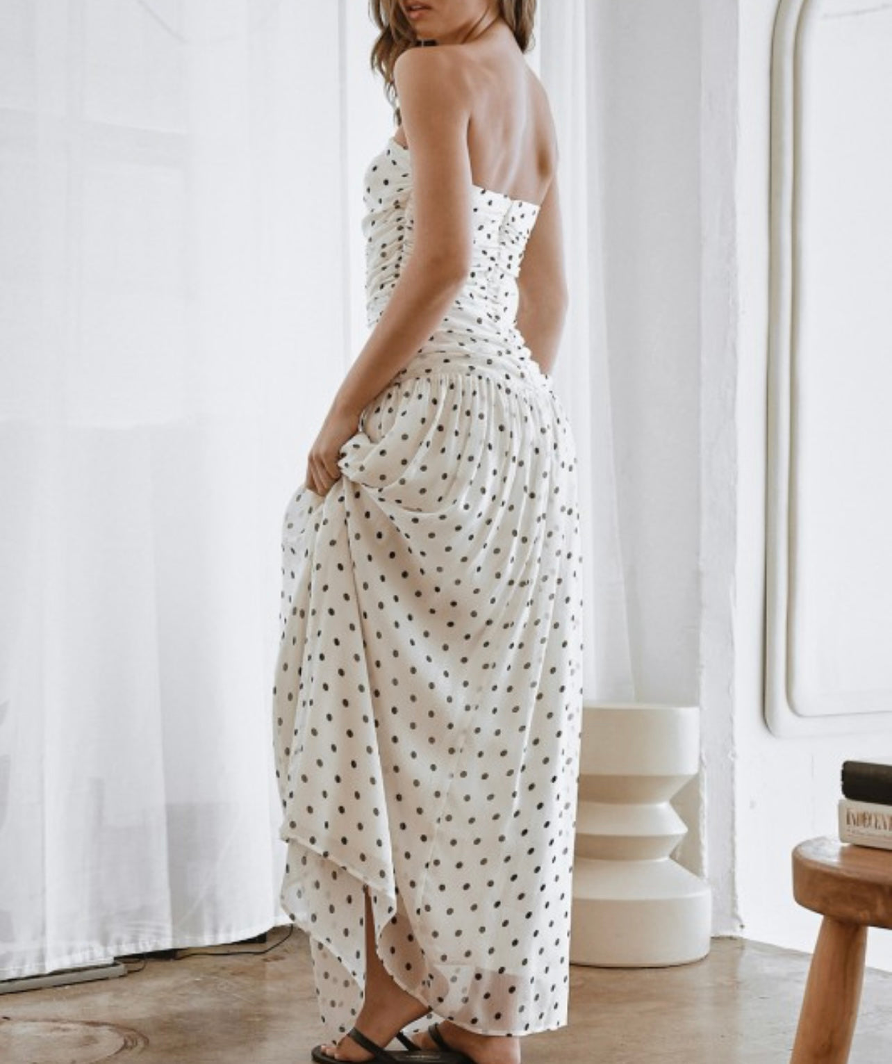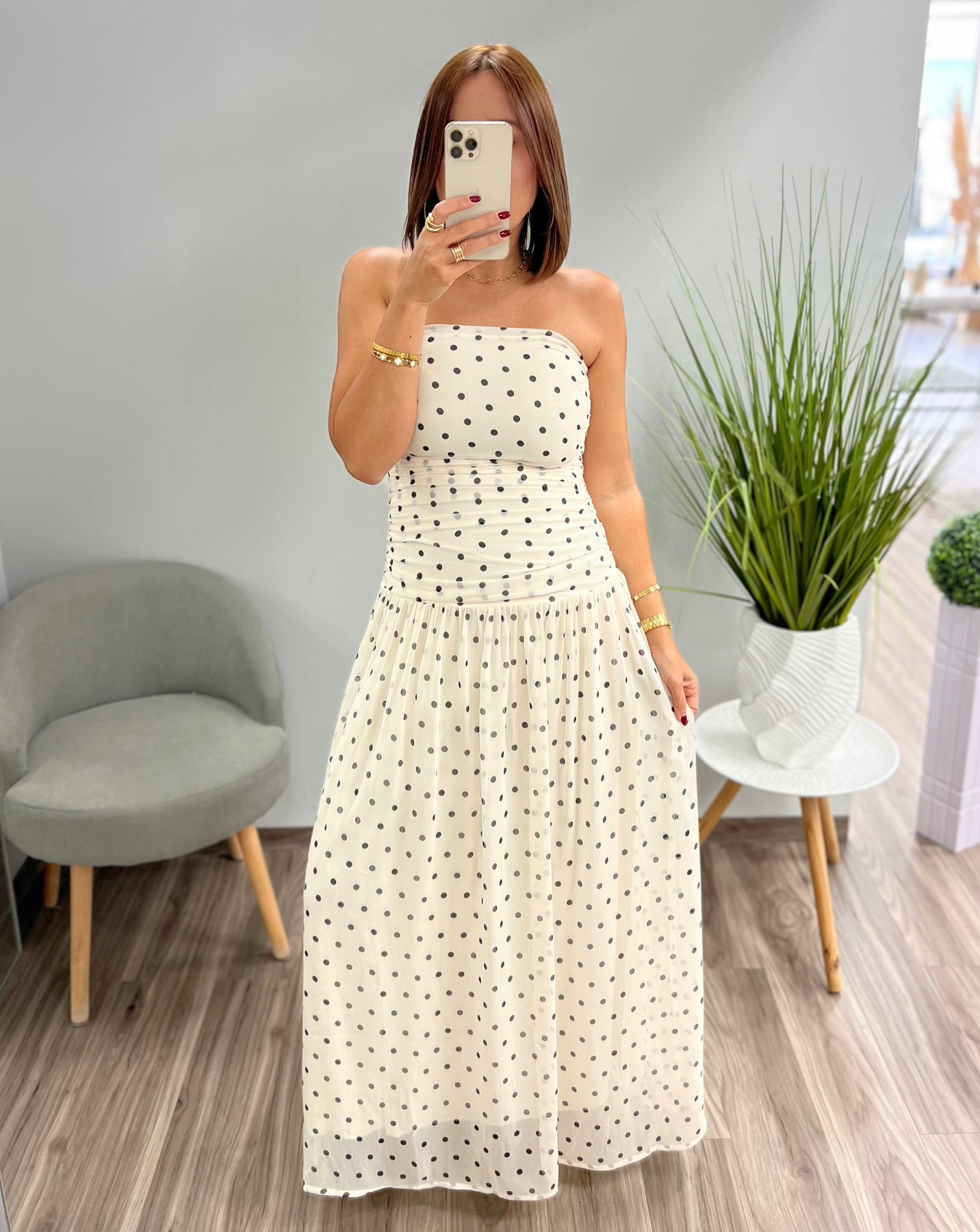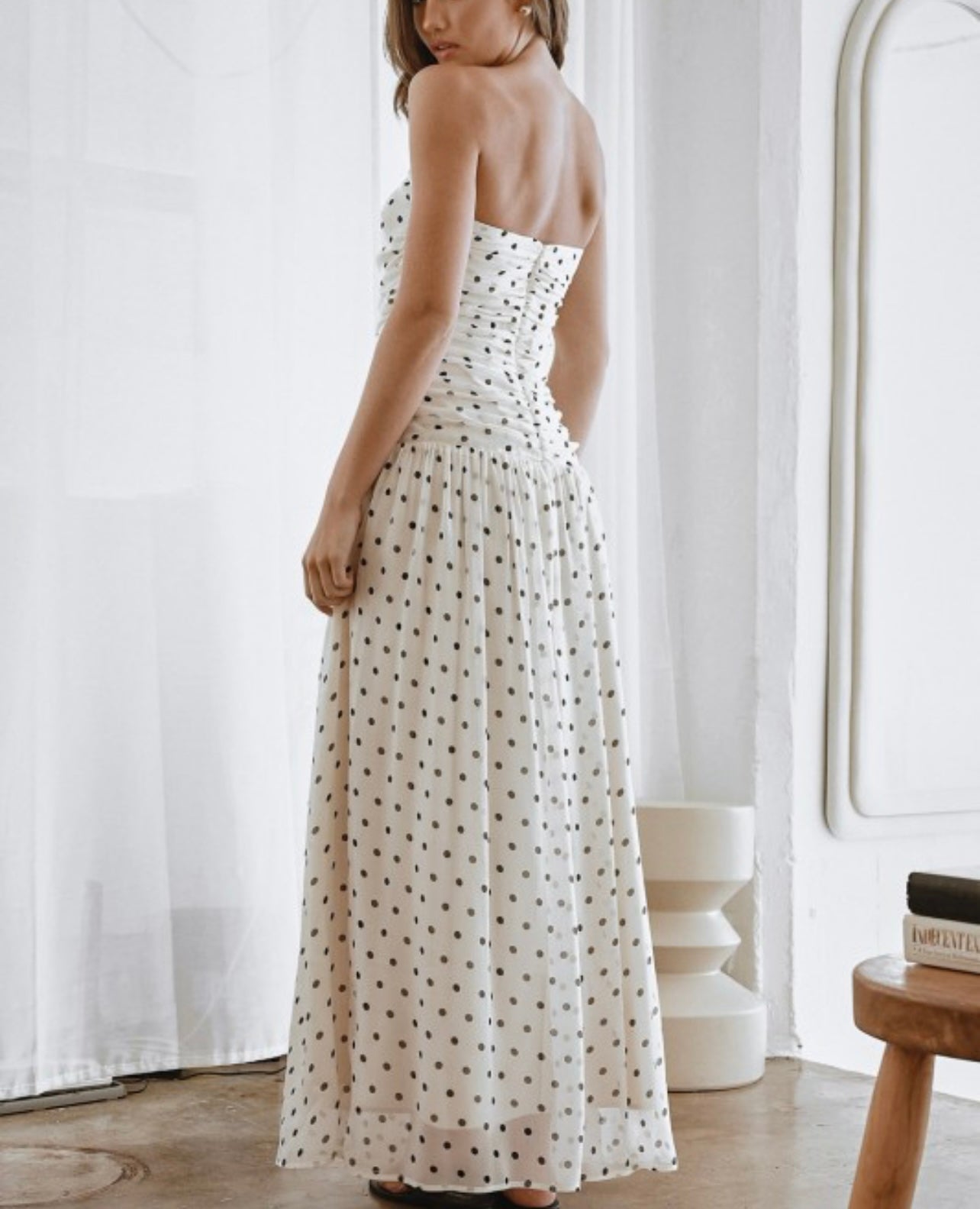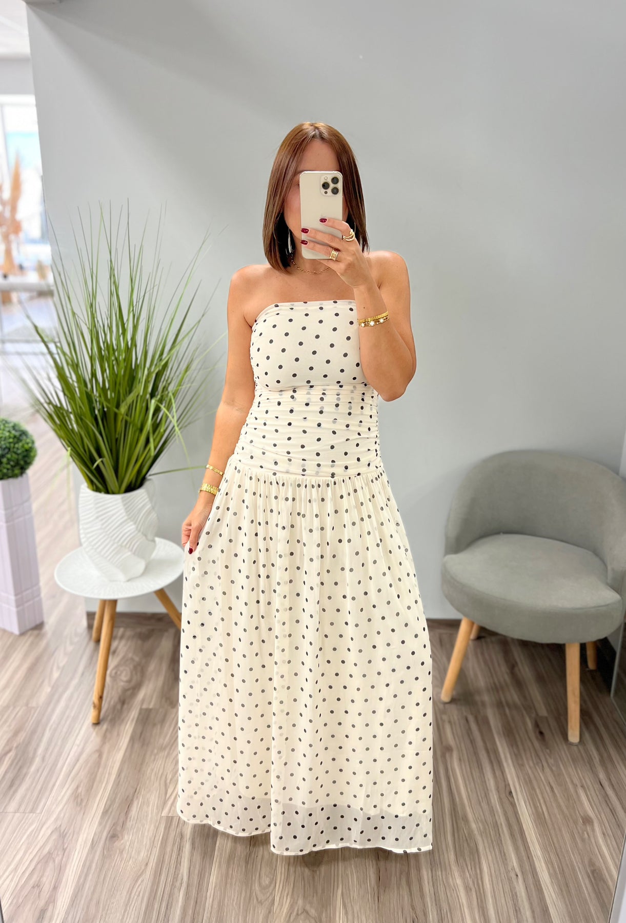 Cream/Black Ladies King Shirred Polka Dot Strapless Tube Maxi Dress