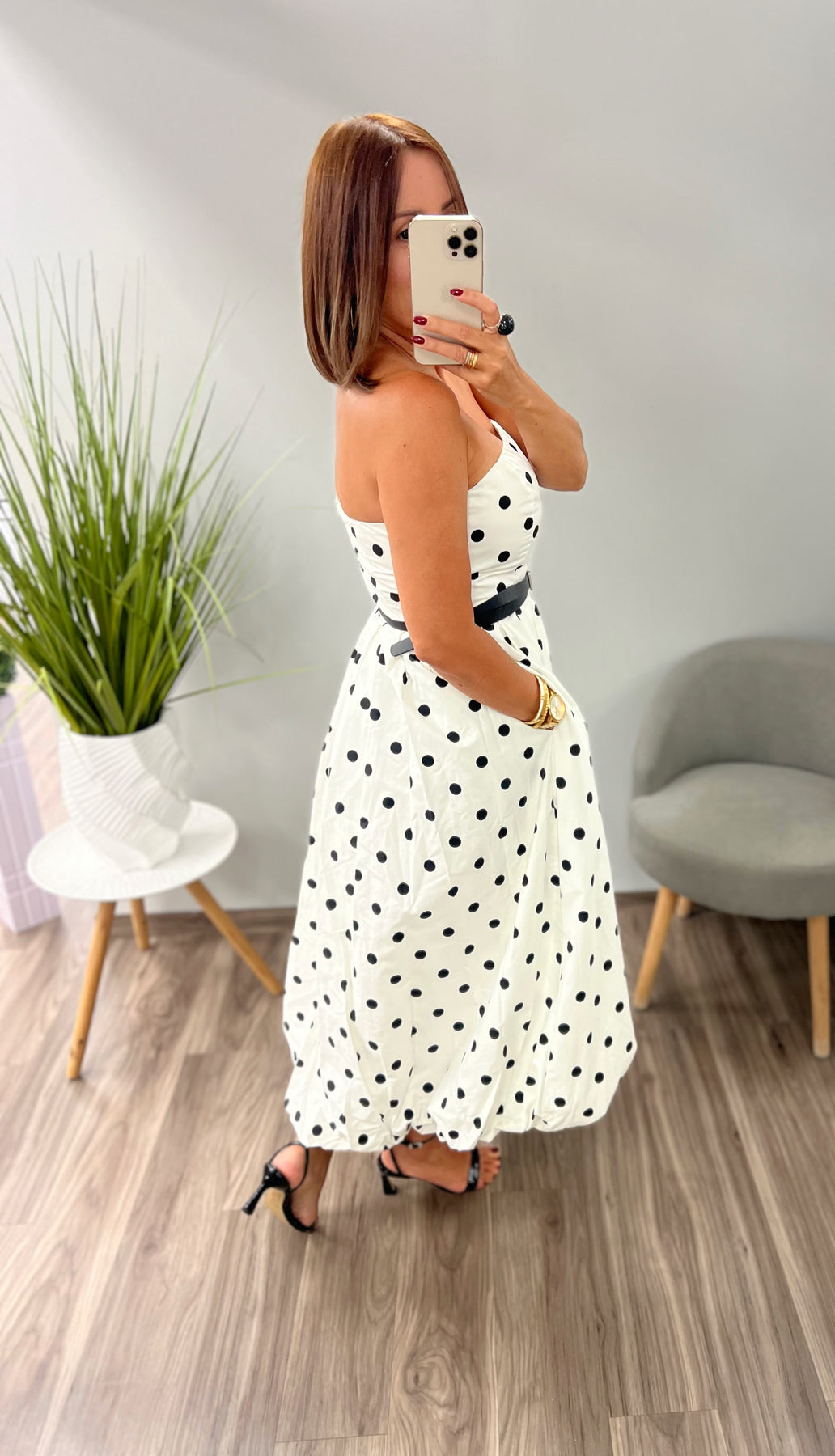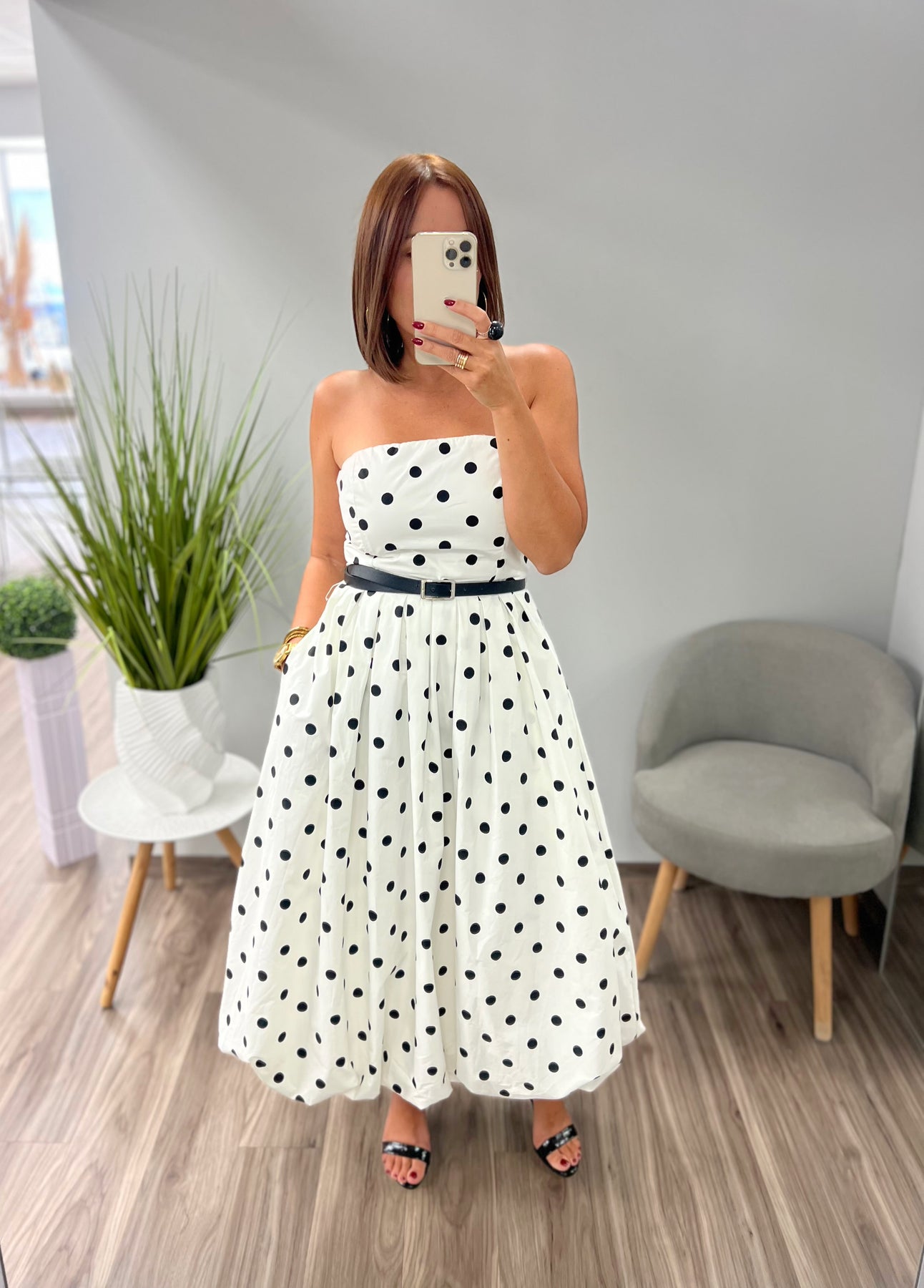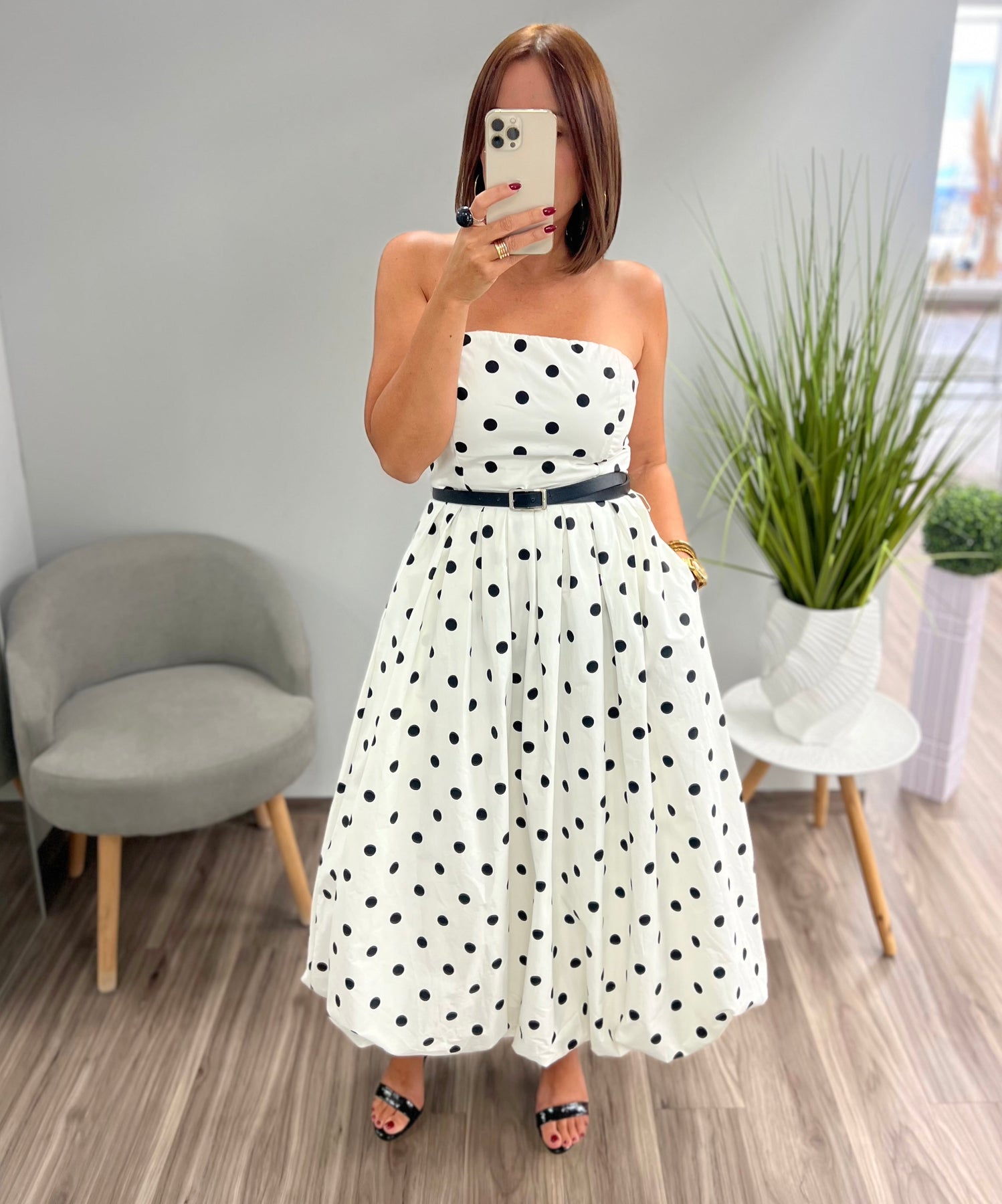 Strapless Midi Dress, contrasting belt, full skirt, bubble hemline anda back zipper closure