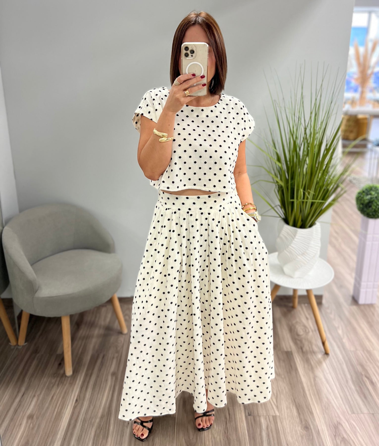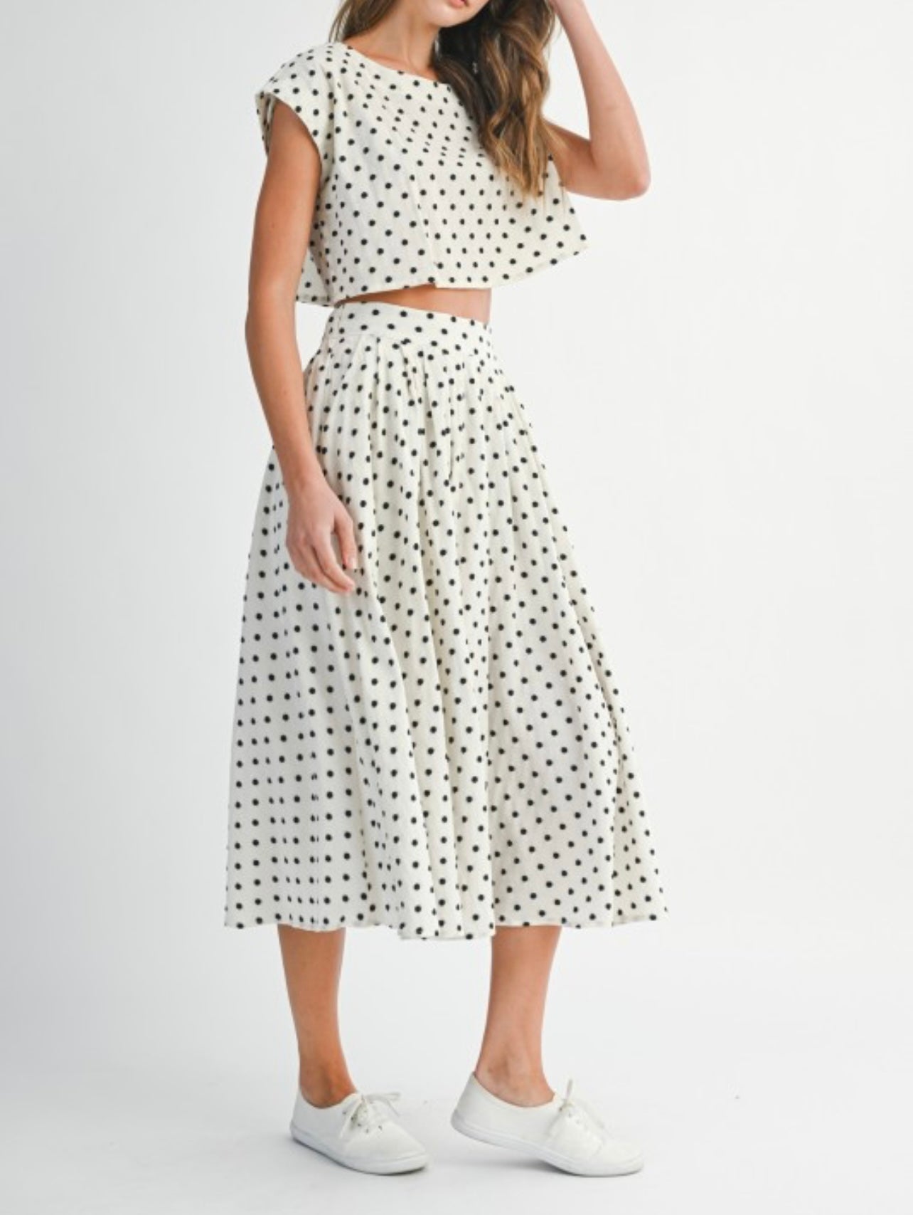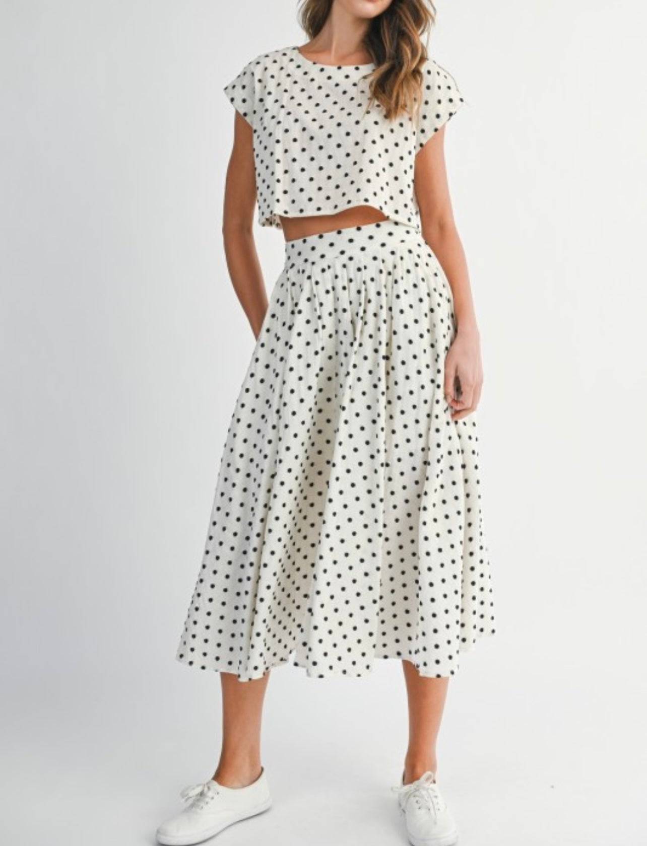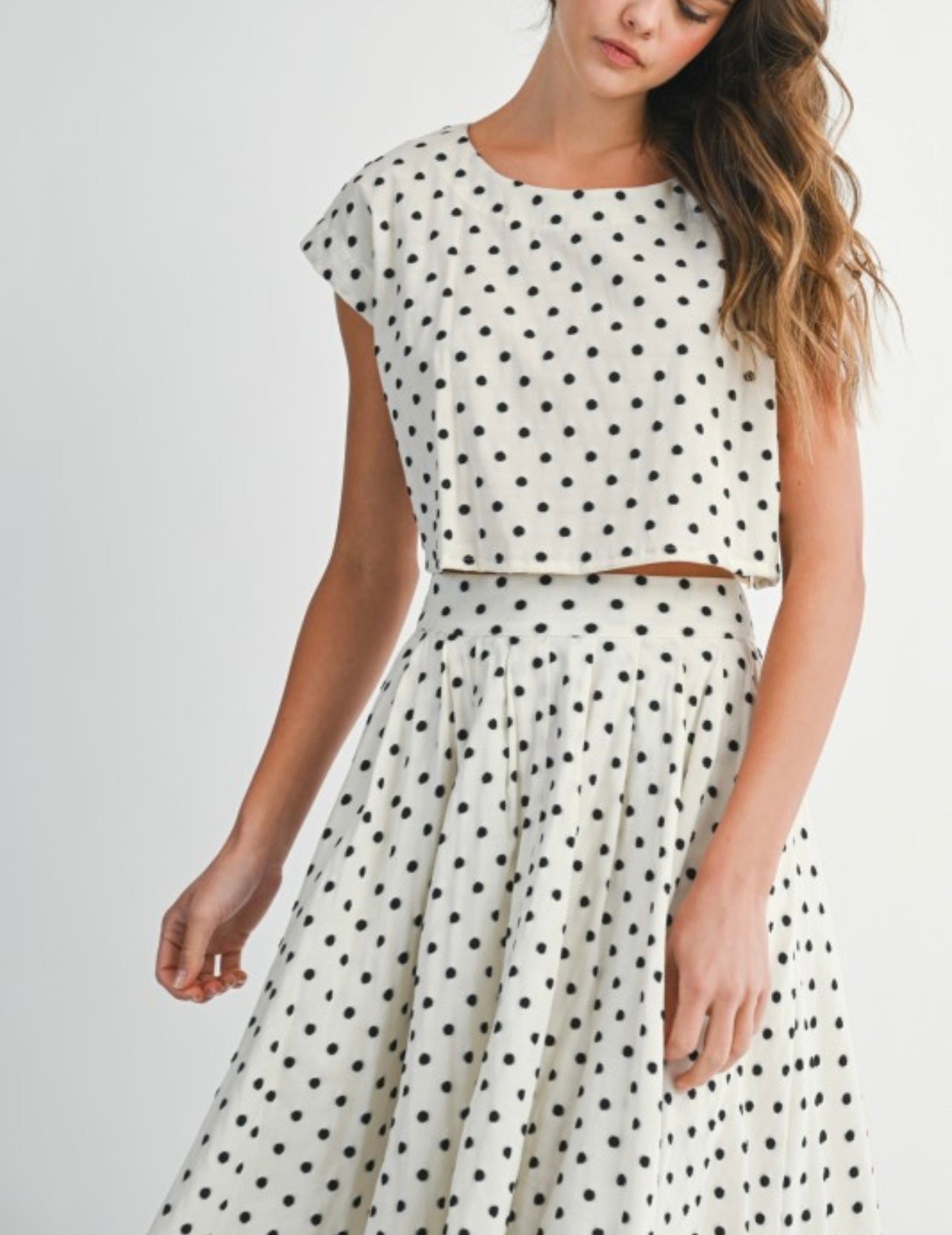 La falda tiene elástico en la cintura y el top el estilo es anchito.