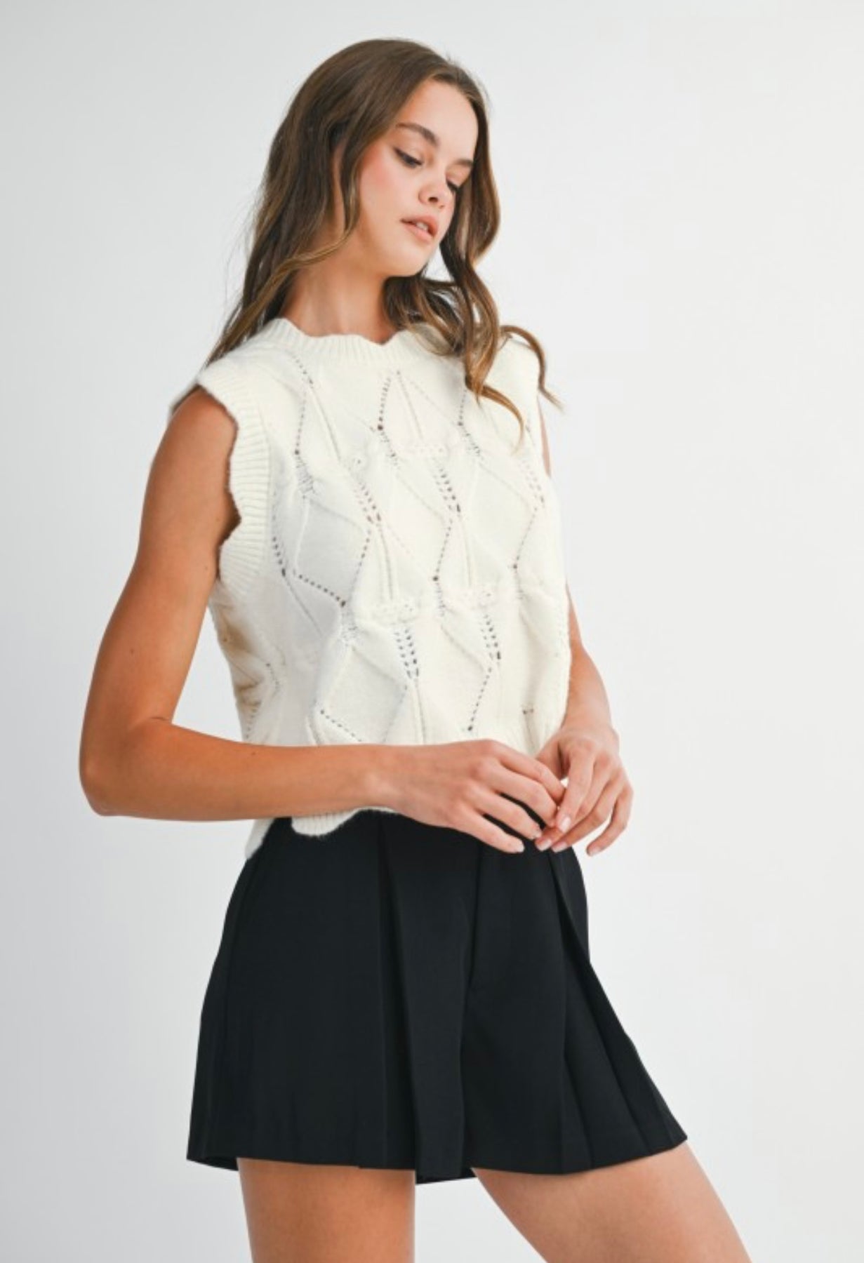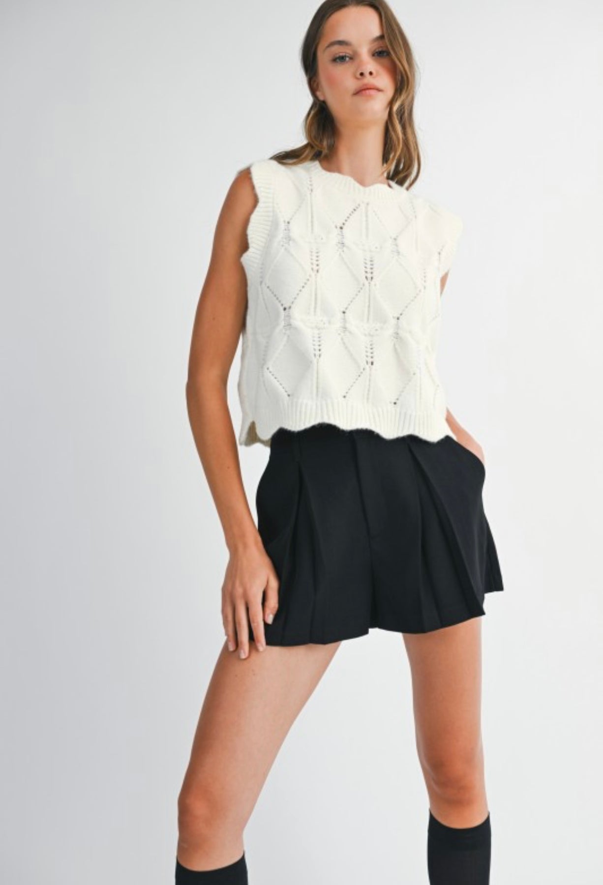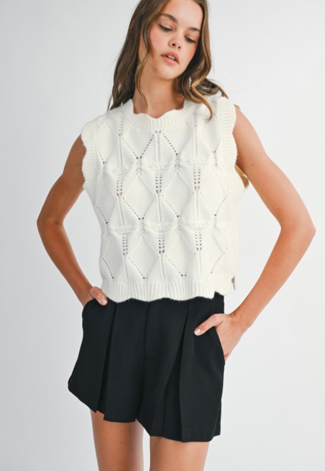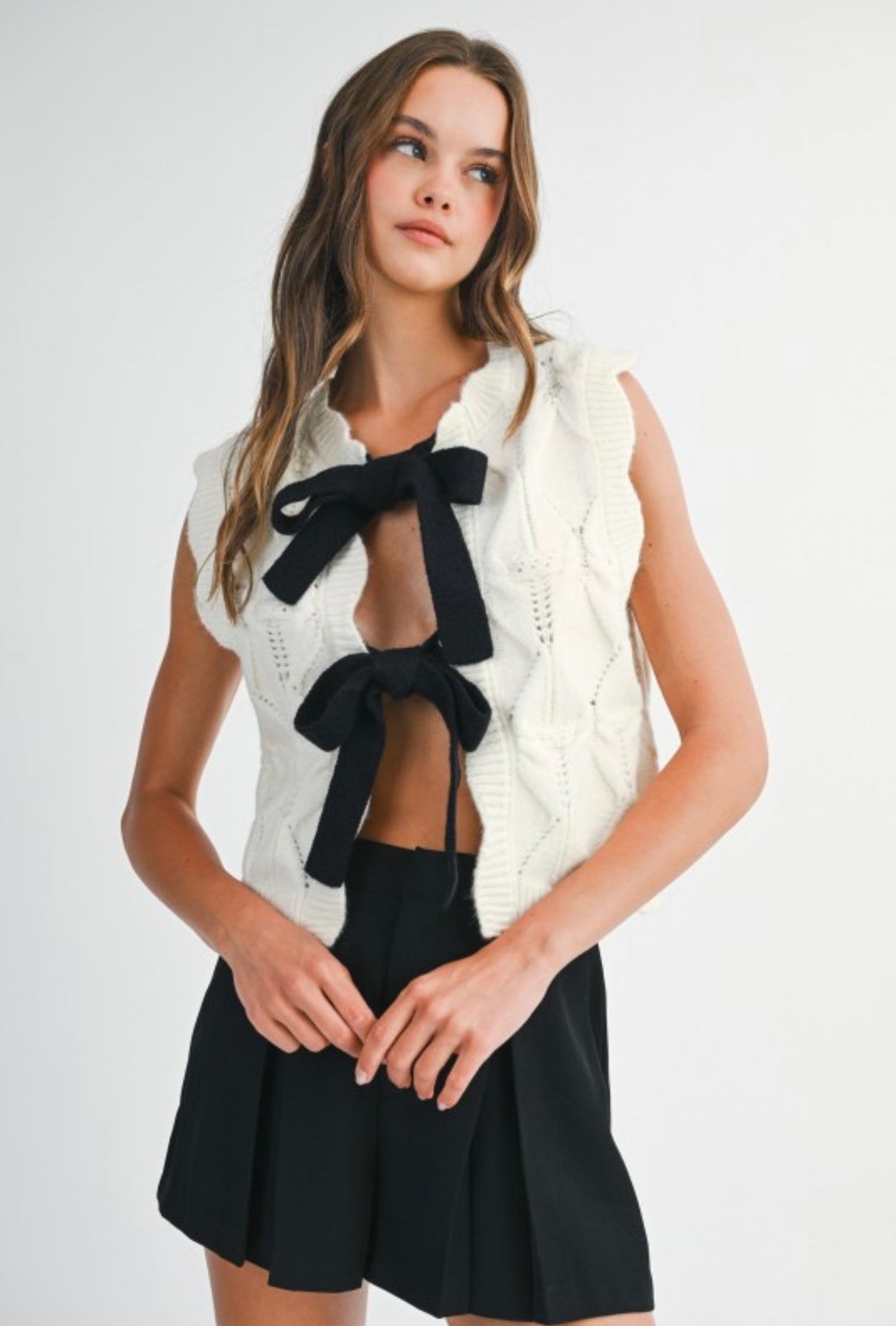 Cream Cable Knit Scalloped Vest With Contrast Bow Tie Top