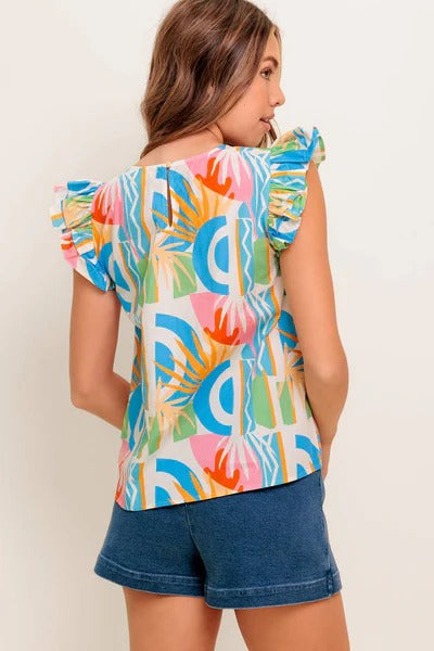 Top Featuring round neckline, double ruffled sleeve and back keyhole button closure.