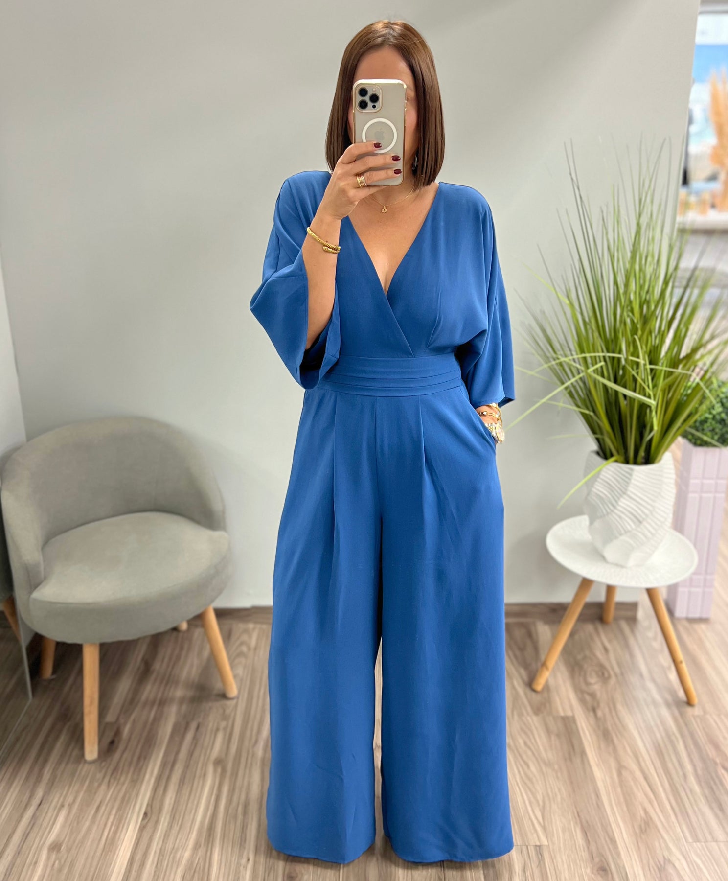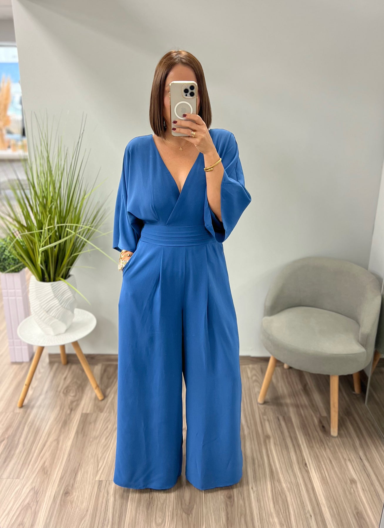 Denim Blue Woven 3/4 Sleeve V-Neck Jumpsuit